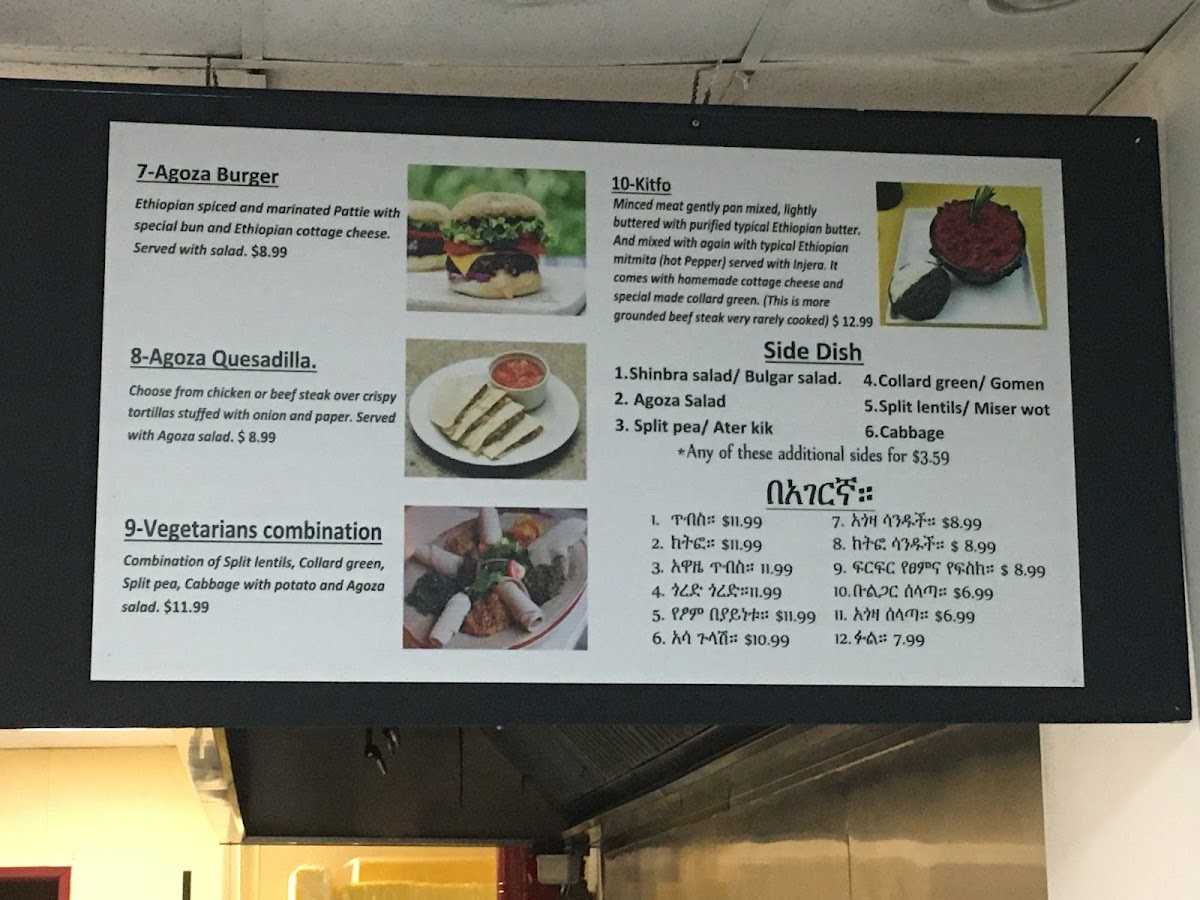 Overall, Agoza Gebya provides a well-rounded menu with options for everyone. Whether you're in the mood for a light salad, a delicious burger, or a traditional Ethiopian-inspired dish, the restaurant has something to satisfy your cravings. With its diverse selection, it’s a great spot for both casual dining and a satisfying meal with friends or family.